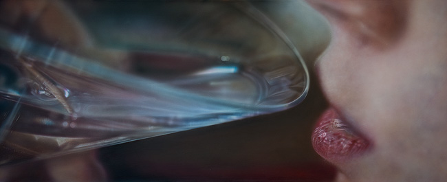 | At the end of his garden, his studio is a temporary home to four of six of his latest paintings, the series ‘In a Suspended State’ – at the time of writing, two have already been sold. The series includes In a Suspended State of Happiness, a close-up of a woman’s lipsticked mouth about to sip from a glass of dry Martini. The imminence of the contact between her lips and the elegantly thin bluish glass of the drink is at the heart of the painting; the rest of the detail of the scene slides out of focus. |