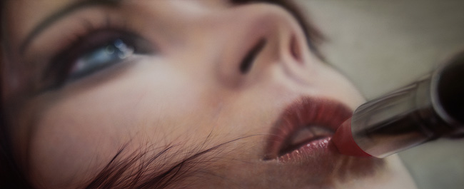 | For At This Moment with You, Simon has photographed for his source material a model applying lipstick, the pose taken from a film sequence. In the language of film, putting makeup on signifies something; in his paintings, Simon stresses the telling detail of the kind of objects that are referenced in film to enhance and coax meaning from a scene. But again, as with We Were in This Together and then You Were Gone, the meaning is unclear; the viewer is left with a series of compelling but mysterious elements of a fragmentary narrative. |