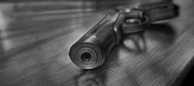 | We Were in this Together and then You Were Gone depicts a replica gun, barrel pointing at the viewer, lying on a table top, in black and white. The use of a very familiar cinematic prop raises many questions about fact and fiction, photography and painting. The works undeniably comment on art mirroring reality, but also further layers of meaning arise in the process of the transformation the chosen objects undergo between the media of photography and painting. The metallic weight of the gun resting on the table, and the angle of it, implies that it is loaded; as a metaphor, it is also loaded in the sense of being pregnant with meaning. |