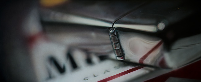 | In The Truth Is.... Sometimes I Miss You So Much I can Hardly Stand It, an immaculate vision of a shiny Zippo lighter reflects the iconic black, white and red of a cigarette packet. The sharpness of the focus in the centre and the rushing away of detail into the periphery mean that the painting mimics the panning round of a camera; these are images imbued with movement and a heady intimacy of viewpoint. |